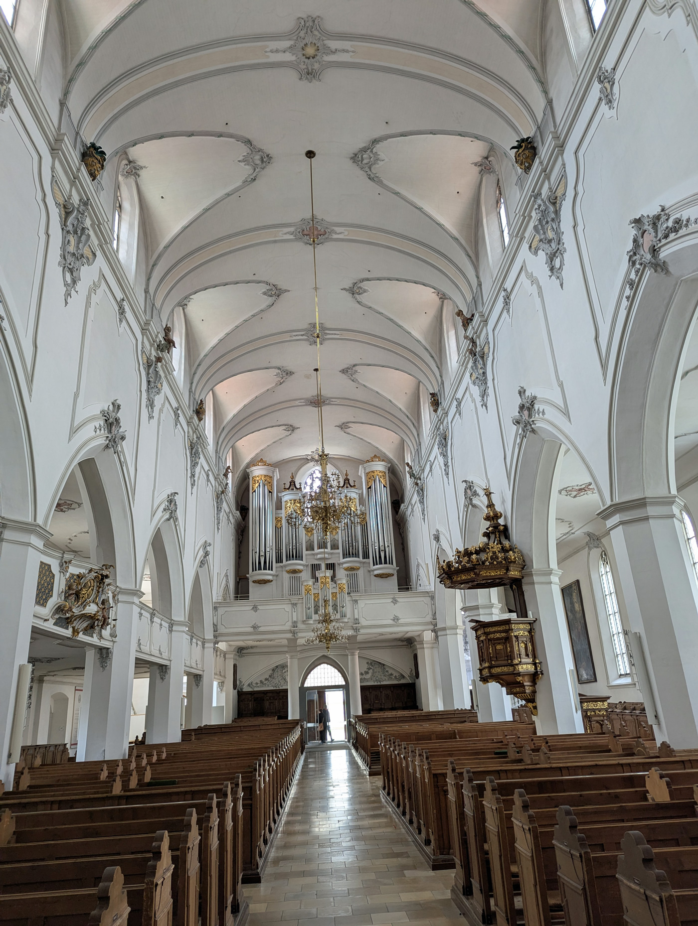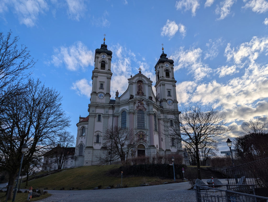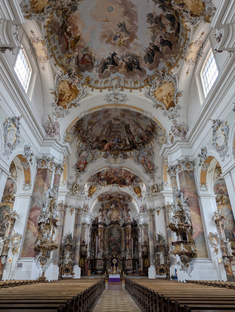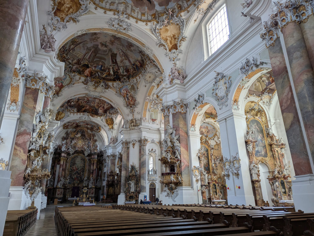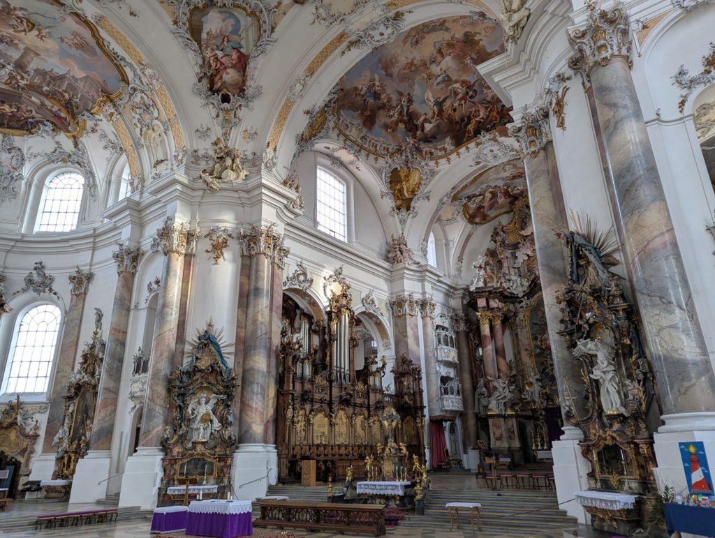 Obwohl wir keine Fans von Barockbauwerken sind, gönnten wir uns am Hochzeitstag 😊 einen Besuch in Ottobeuren und der dortigen Basilika St. Alexander und St. Theodor. Die Basilika ist die Kirche der oberschwäbischen Benediktinerabtei Ottobeuren im Landkreis Unterallgau. Im Gegensatz zu vielen anderen Kirchen ist sie nicht geostet, sondern nach Süden ausgerichtet. Die erste Kirche muss wohl mit der Klostergründung im Jahr 764 erbaut worden sein. Schon 1089 folgte ein Neubau (und fleißig so weiter), aber die heutige Basilika wurde zwischen 1737 und 1766 erbaut. Es leben auch noch eine Handvoll Benediktinermönche im Kloster. Uns erschlägt diese Pracht immer, weshalb wir den romanischen Baustil stets bevorzugen.