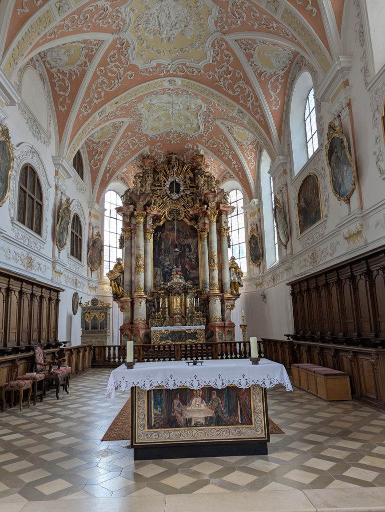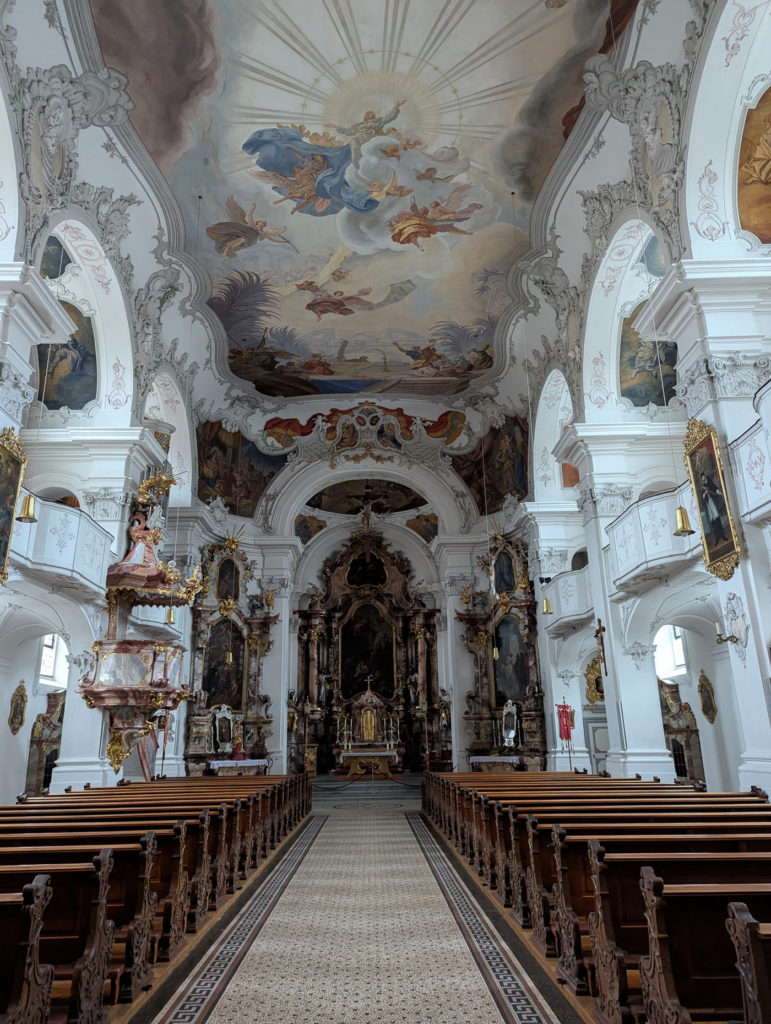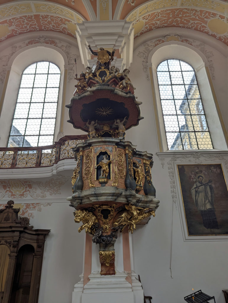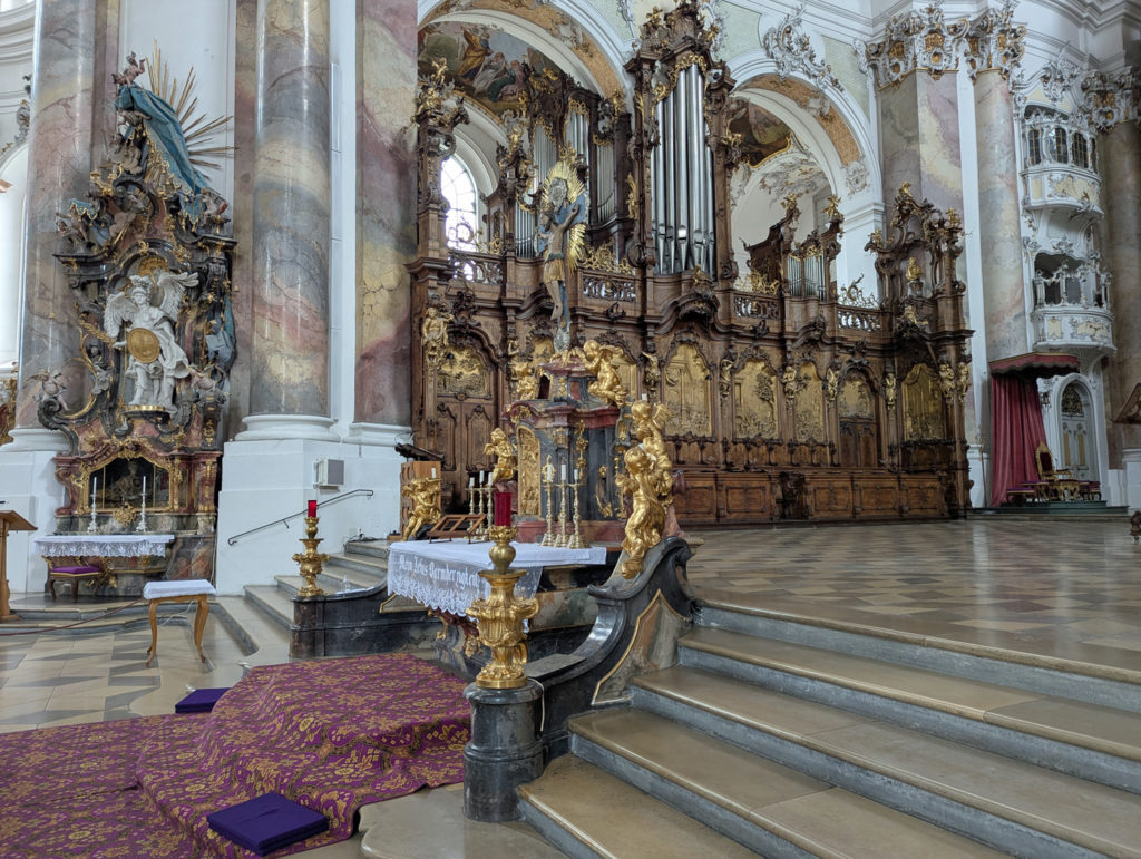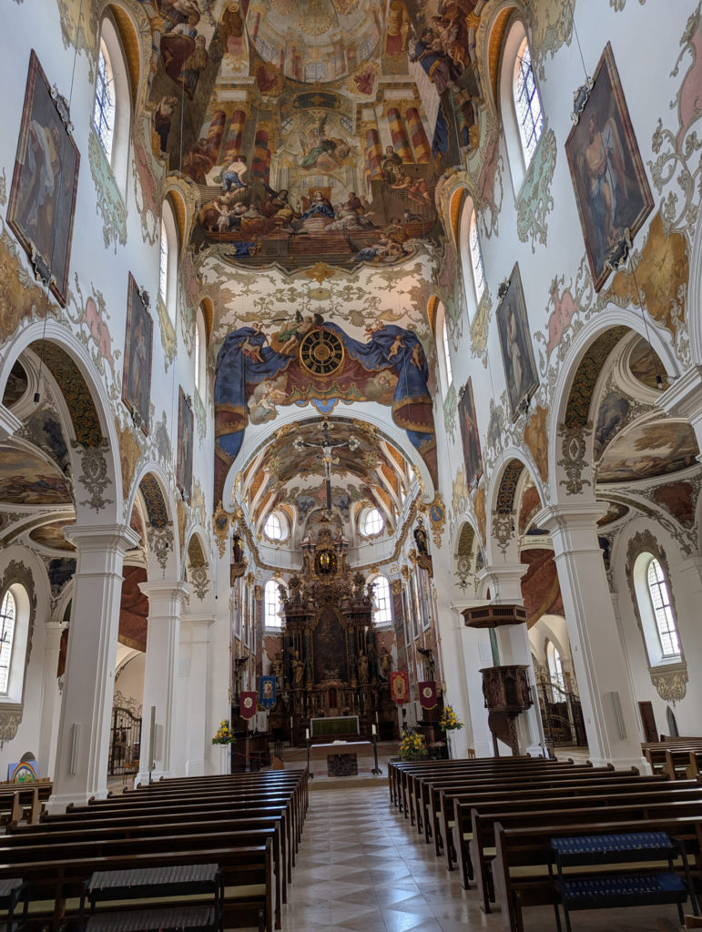 Obwohl wir keine Fans von Barockbauwerken sind, gönnten wir uns am Hochzeitstag 😊 einen Besuch in Ottobeuren und der dortigen Basilika St. Alexander und St. Theodor. Die Basilika ist die Kirche der oberschwäbischen Benediktinerabtei Ottobeuren im Landkreis Unterallgau. Im Gegensatz zu vielen anderen Kirchen ist sie nicht geostet, sondern nach Süden ausgerichtet. Die erste Kirche muss wohl mit der Klostergründung im Jahr 764 erbaut worden sein. Schon 1089 folgte ein Neubau (und fleißig so weiter), aber die heutige Basilika wurde zwischen 1737 und 1766 erbaut. Es leben auch noch eine Handvoll Benediktinermönche im Kloster. Uns erschlägt diese Pracht immer, weshalb wir den romanischen Baustil stets bevorzugen.