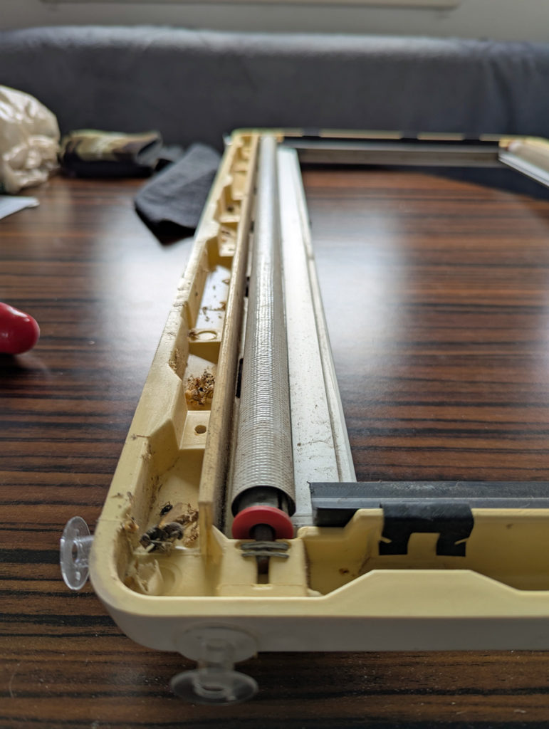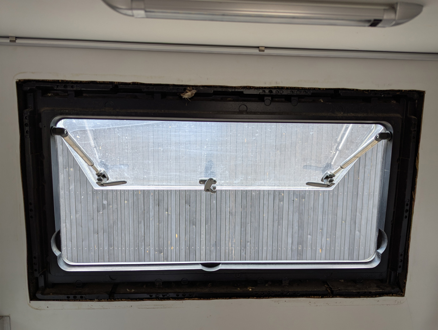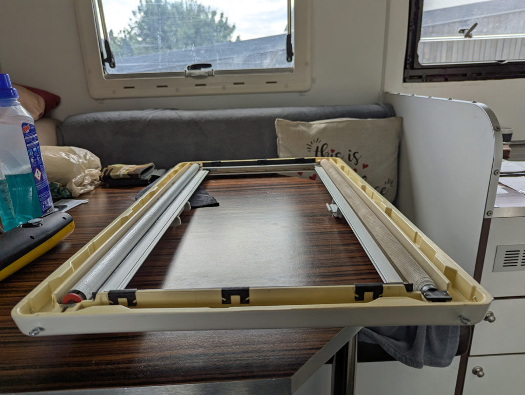 Unsere Moskitogitter hatten ein bisschen Pflege unbedingt notwendig! Wir montierten die kompletten Rahmen ab, reinigten sie und die Fensterausschnitte gründlich. Unglaublich, was sich da alles für Tierchen angesammelt hatten! (Anmerkung Chris: Ja, Reinigung ist wichtig, Funktion noch wichtiger 😉. Wir spannten die Gitter / Verdunkelung nach und ersetzten die in Mexiko geklebten Halterungen aus Plastik-Nähmaschinenrollen für unsere zusätzlichen Mückengitter (Tüll 😉) mit Haken, die jetzt hoffentlich besser halten werden!)