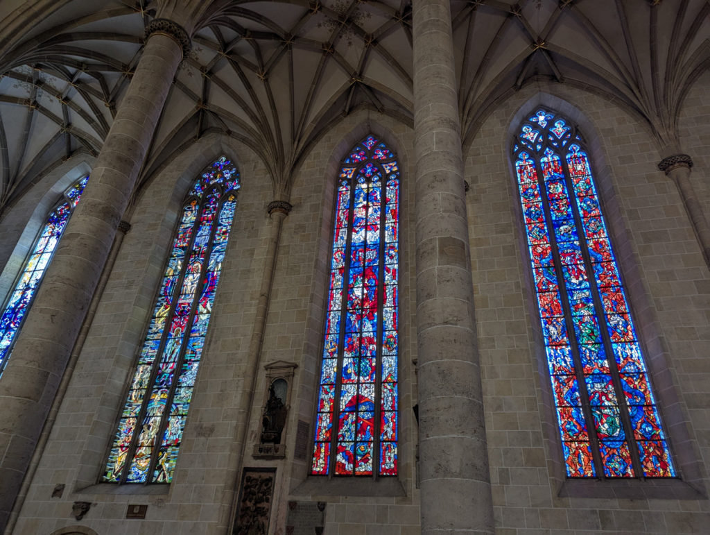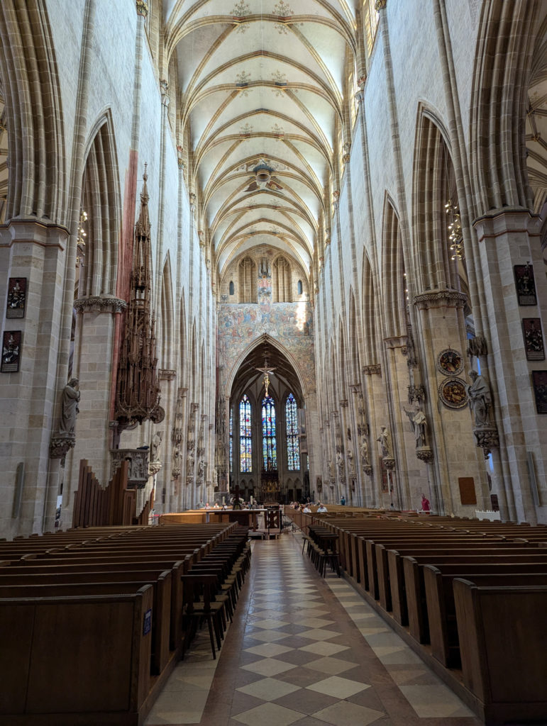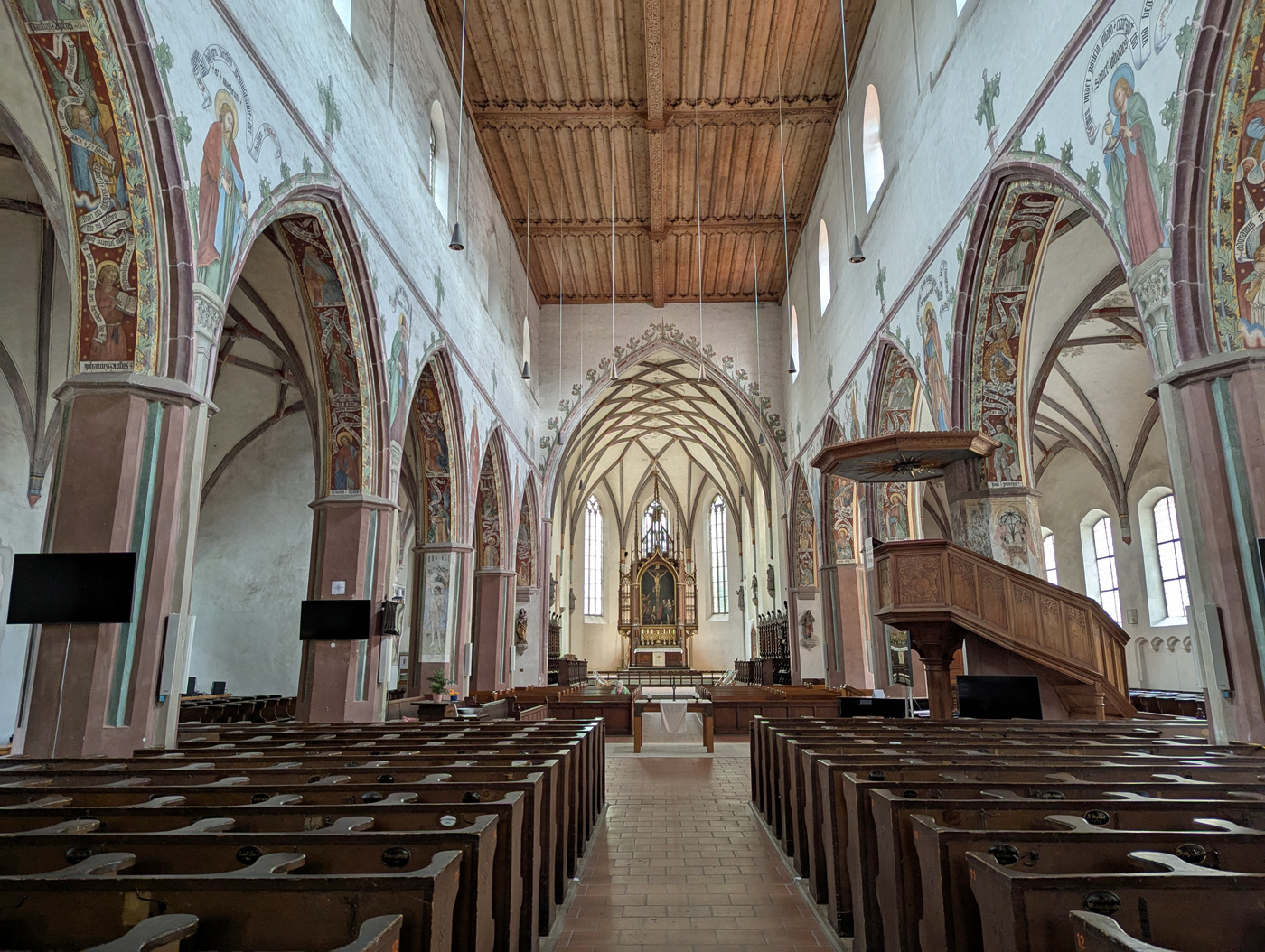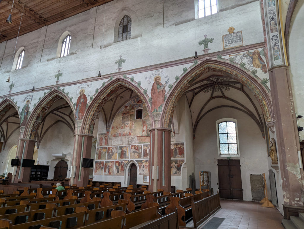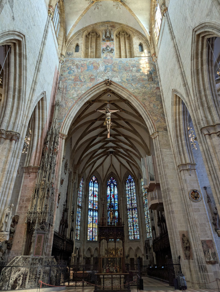 Zwischendrin wieder Kultur 😊. Bekannt ist die Kirche „Unser Frauen“ in Memmingen auch als „Zu unserer lieben Frau“ oder „Frauenkirche“ und sehenswert sind die Fresken aus der Anfangszeit der Memminger Schule im 15. Jahrhundert. 1258 wurde sie erstmals urkundlich erwähnt, Vorgängerbauten sind jedoch sehr viel älter (vorrömische Zeit). Im 14. und 15. Jahrhundert war sie eine sehr bedeutende Kirche, die sogar aufwändig in einen gotischen Bau umgewandelt wurde. Im 16. Jahrhundert jedoch waren in der Gemeinde „Unser Frauen“ Weber, Metzger, Gerber, kleine Krämer sowie die „unreinen“ Stände mit dem Scharfrichter und den Huren ansässig.