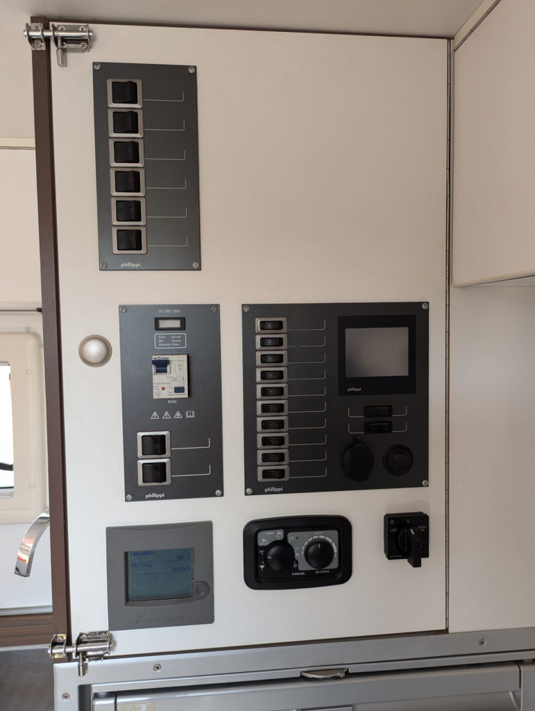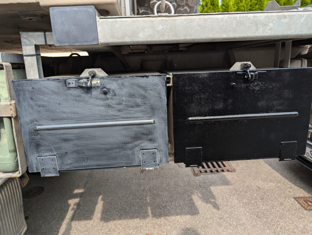 Als nächstes bekam Muddy eine umfangreiche Rostbehandlung der Außenkästen und der Gefechtsluke im Fahrerhaus und natürlich wieder eine schöne Lackierung 😊. Die Tür des Elektroschranks kann jetzt durch zwei zusätzliche Haken geschlossen und fixiert werden, damit sie vor allem beim zukünftigen Offroad-Einsatz entlastet wird. Und Zuhause gab es natürlich immer etwas zu tun!