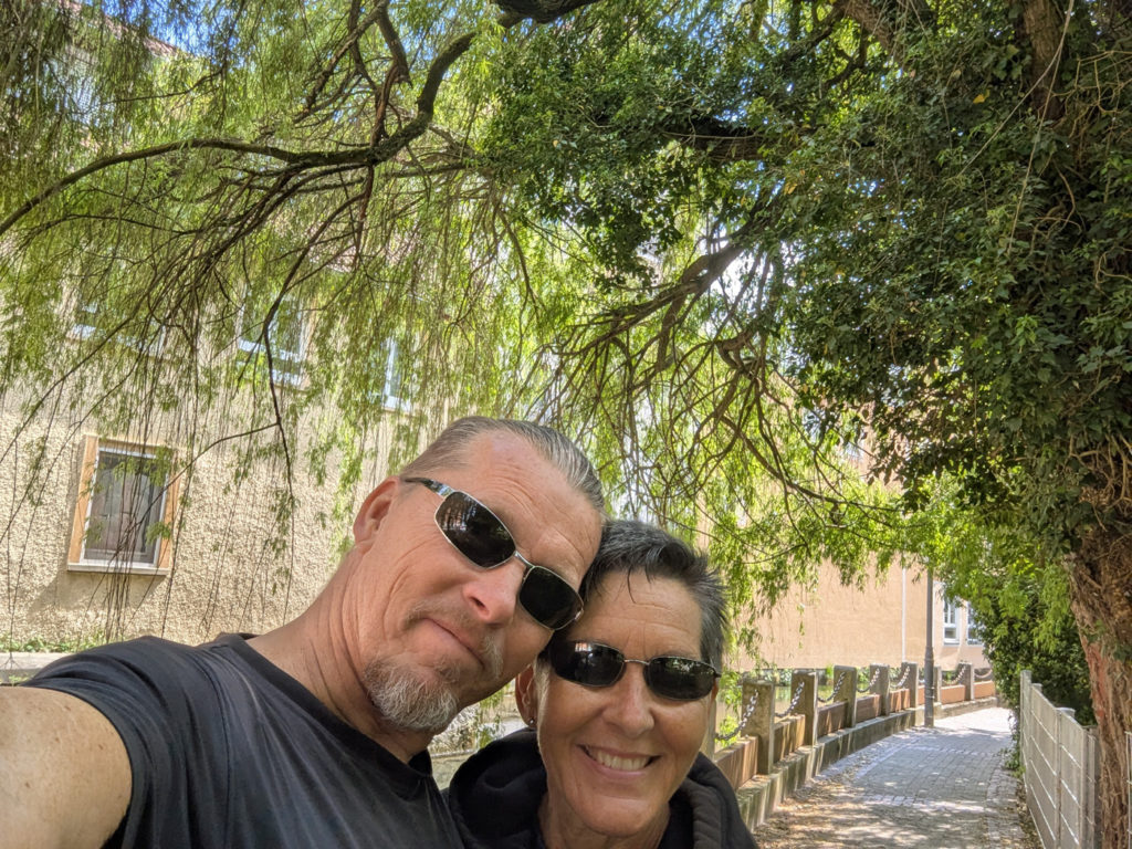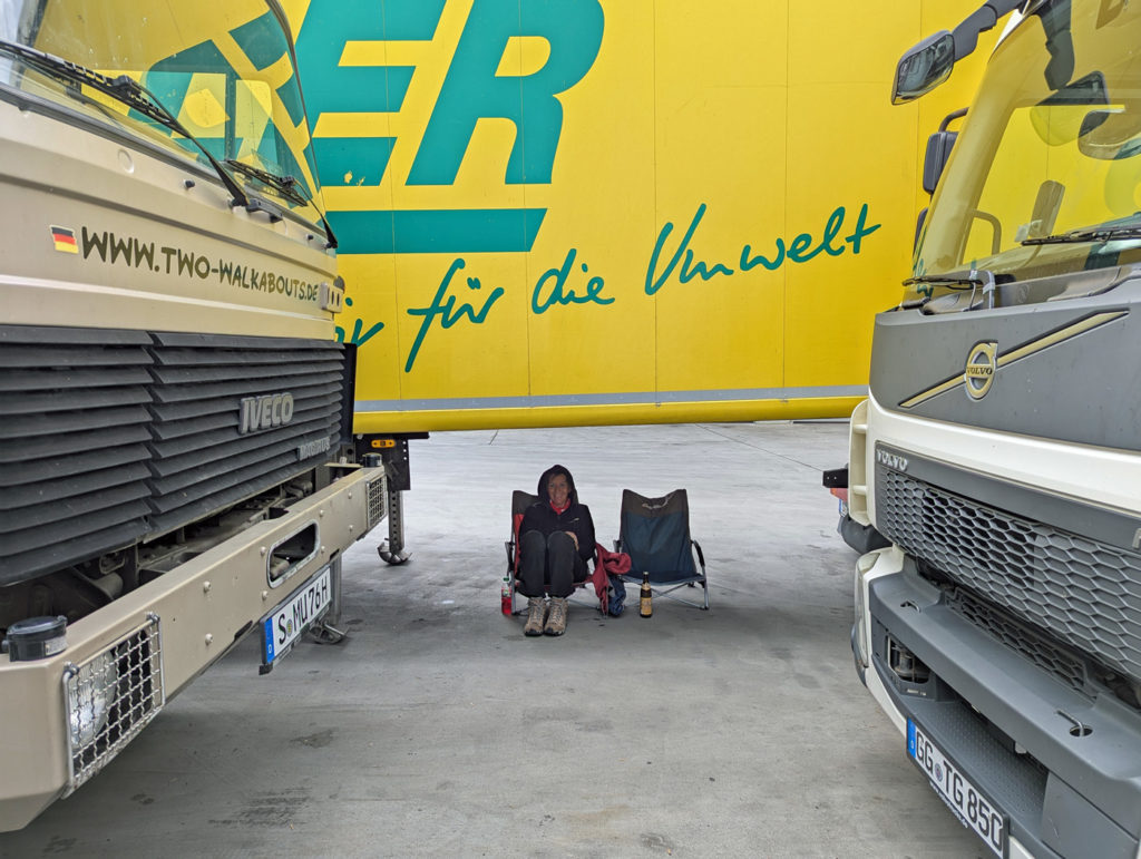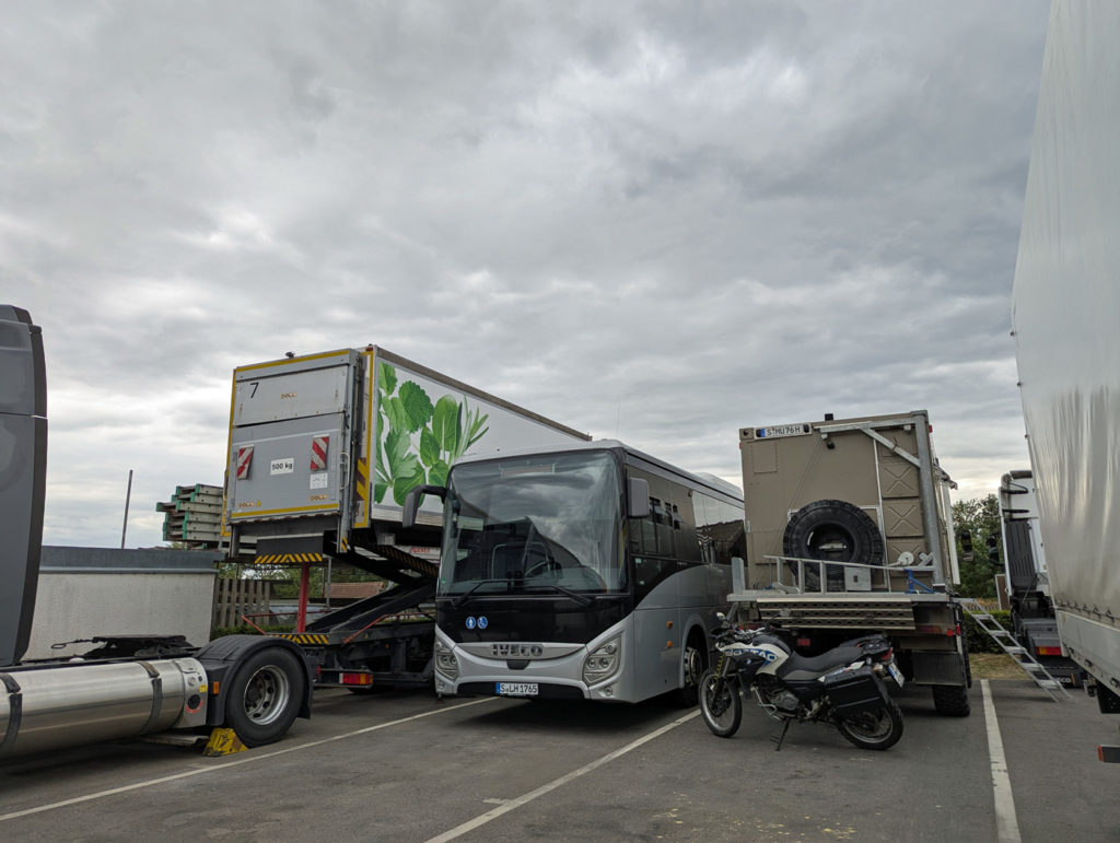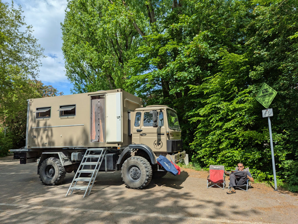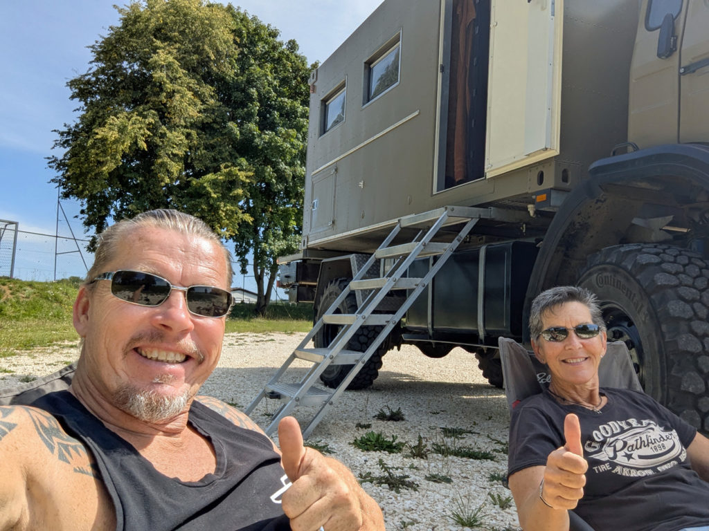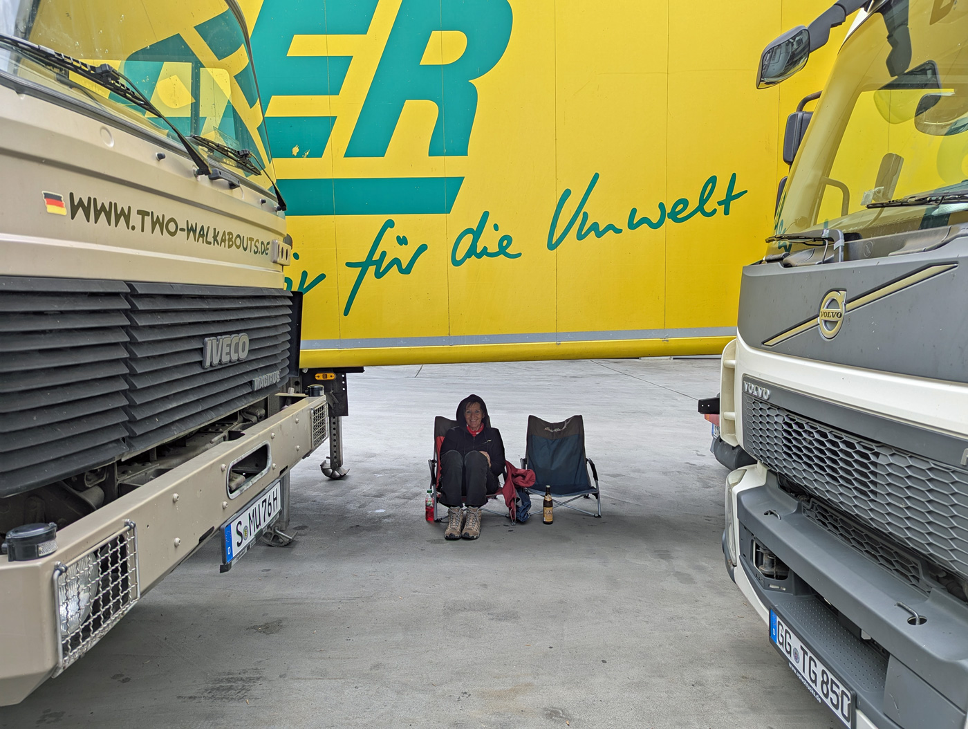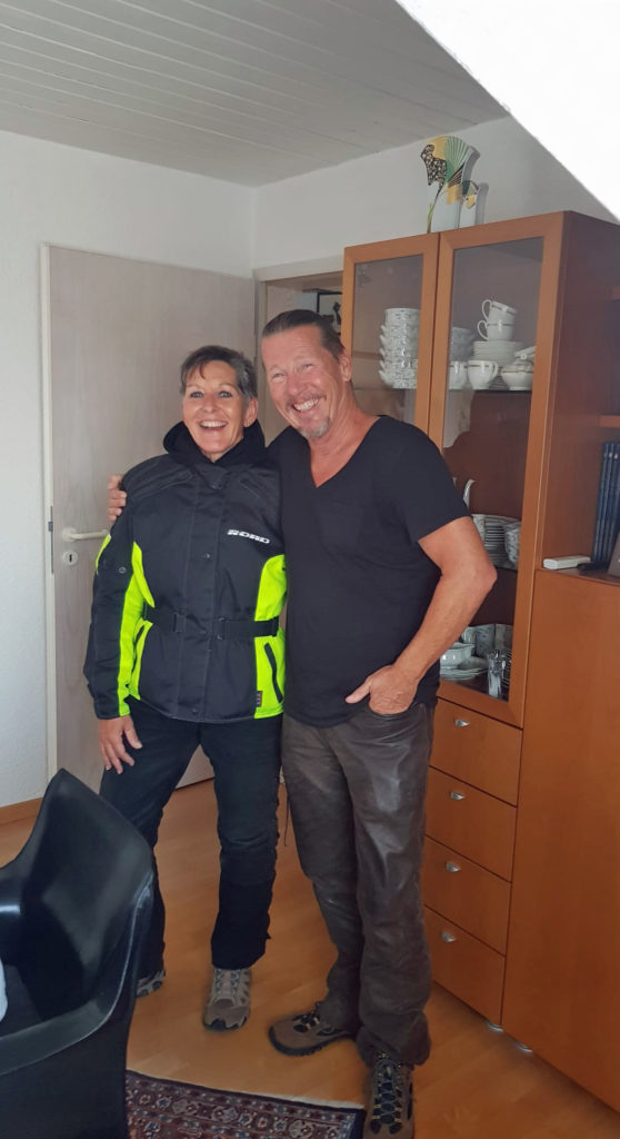 Unser Termin in Stuttgart zum Check up von Muddy (und uns) nahte. Wir durften sogar auf dem Firmengelände von Scharr Truck übernachten. Es war sehr romantisch 😉! An dieser Stelle: Ein herzliches Dankeschön an Sabine und Klaus für ihren support! Tagsüber waren wir mit dem Motorrad unterwegs zu zahlreichen Arztterminen und wir besuchten auch meinen früheren Chef in Ludwigsburg, Siegfried (und seine Frau Helga). Die Wiedersehensfreude war riesig!