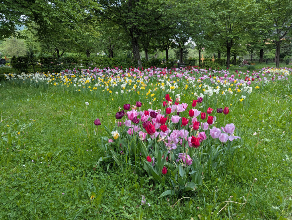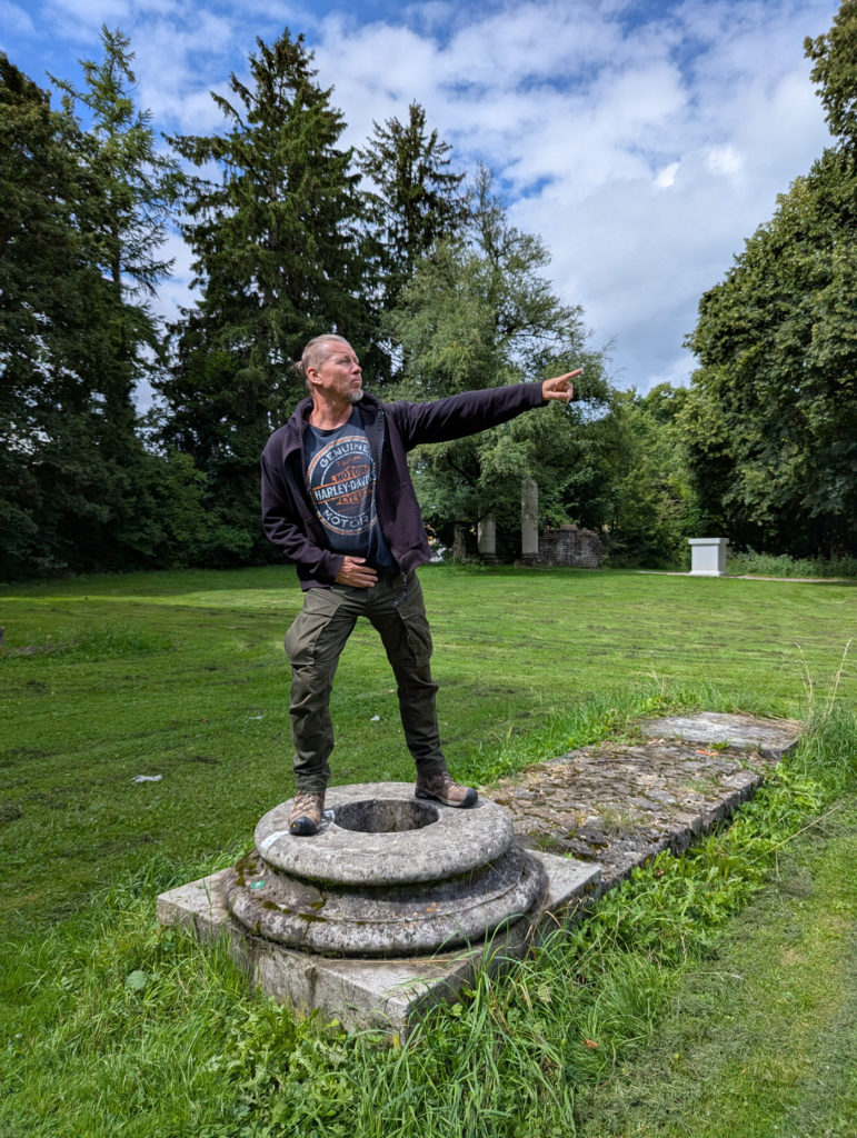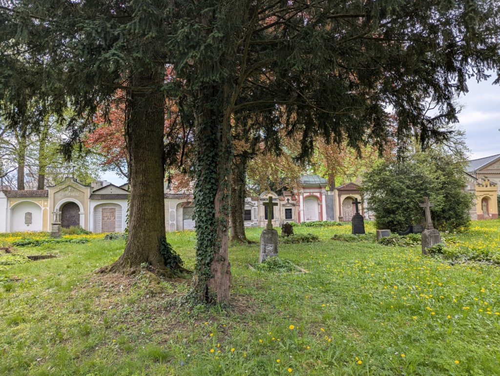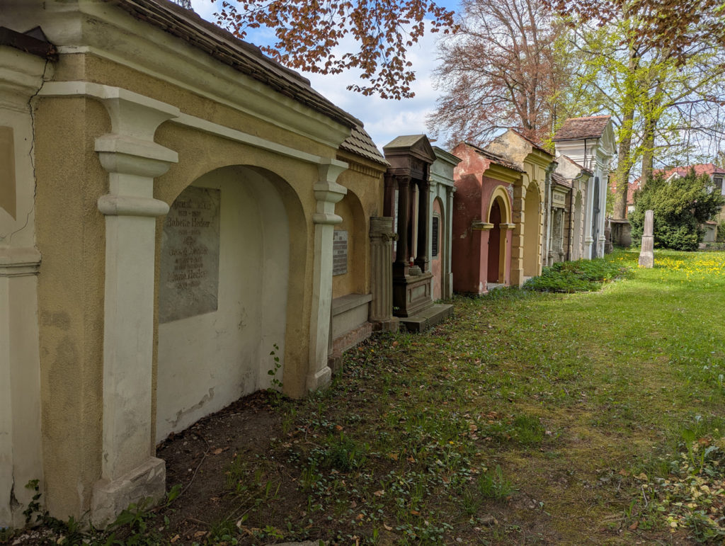 Leider ist der alte Friedhof von Memmingen sehr verwildert und aufgrund einer massiven Zeckenplage trauten wir uns nicht näher an die alten Grabanlagen ran, wo das Gras meterhoch wuchs. Das Gelände des Friedhofs diente seit 1167 dem sogenannten Schottenkloster Memmingen, welches 1512 bzw. 1529 abgebrochen wurde (kein Nachwuchs). Da 1529 die Krankheit „Englischer Schweiß“ ausbrach (es ist bis heute unklar, worum es sich bei dieser Krankheit handelte. Aber der Tod kam innerhalb von wenigen Stunden) und die zwei reichsstädtischen Friedhöfe nicht mehr ausreichten, kam man auf die Idee auf dem freien Gelände des ehemaligen Schottenklosters den neuen städtischen Friedhof einzurichten. An den Mauern im Südwesten und Nordwesten befanden sich die Gräber der vornehmen und reichen Familien. Sie lagen am weitesten vom Knollenmühlbach entfernt. Die Gefahr einer Überschwemmung war daher gering. Im Inneren des südwestlichen Viertel wurde ein Platz für ein Gemeinschaftsgrab für arme Gerber eingerichtet. Für die Beerdigungen musste die Gerberzunft aufkommen. Das südöstliche Viertel war Beerdigungen armer Bedürftiger und Verstorbener aus Kinds-, Kranken- und Siechhäusern vorbehalten. In der äußersten Ecke des Viertels wurden auch die zum Tode verurteilten Straftäter verscharrt. Im letzten Viertel wurden Personen ohne Bürgerrecht, Fremde, Katholische und Reformierte (!) und die Hitzenhofener Bauern beerdigt. Heute ist der Friedhof aufgelassen und eine Parkanlage. Was ich ein wenig makaber fand: die Stadtkapelle Memmingen hat in der alten Leichenhalle ihren Proberaum!