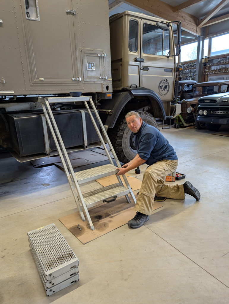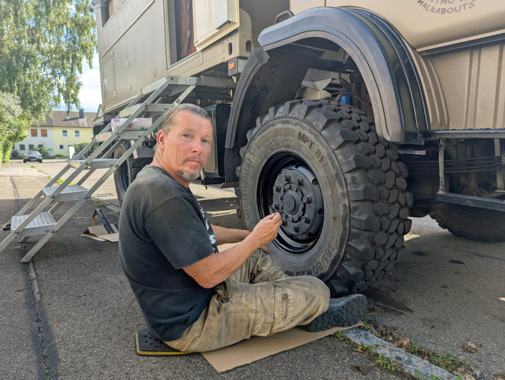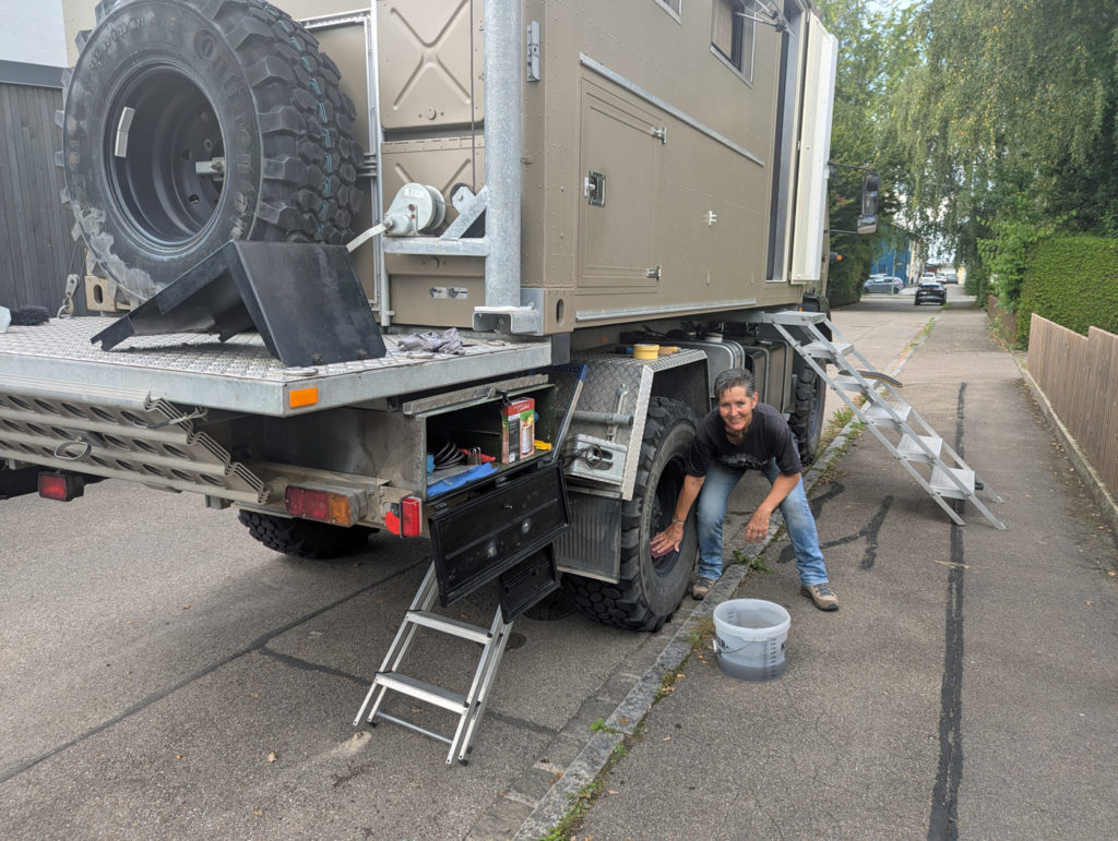 Und auch die „Faulen“ wurden fleißig 😉! Wir nutzten die letzten Tage im Winterlager um unsere Treppenstufen, die undichten Benzinkanister und den Außenspiegel der Fahrerseite schweißen zu lassen (der eifrige Leser/Leserin erinnert sich düster an das „Drama von Arizona“, als sich Chrisi während der Fahrt plötzlich selbst im Außenspiegel sah und nicht mehr den Verkehr hinter sich). Leider war in den USA niemand in der Lage den Spiegel zu schweißen ☹ (Danke Hebbe!). Weil es immer wieder vorkam, dass es in unsere alten Außenboxen regnete, brachten wir einen dickeren Moosgummi an und verließen das Winterlager, wo Muddy so schöne alte Buddys hatte, in Richtung Stuttgart um dort einen Termin bei der Werkstatt unseres Vertrauens für einen Check up von Muddy auszumachen. Unter anderem sollte er neue Stoßdämpfer bekommen (oh ja: mexikanische Pisten sind hart!), einen Ölwechsel, alle Filter mussten gewechselt werden, der Kompressor für die Bremse war nicht dicht. In welchem Zustand waren die Bremsen?